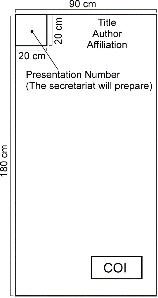・ポスターの最大サイズは90cm (ヨコ) x 180cm (タテ)です。 ポスター上部(70cm (ヨコ) x 20cm (タテ)くらいのスペース)に、演題名、演者氏名、共同演者氏名、所属を提示してください。
